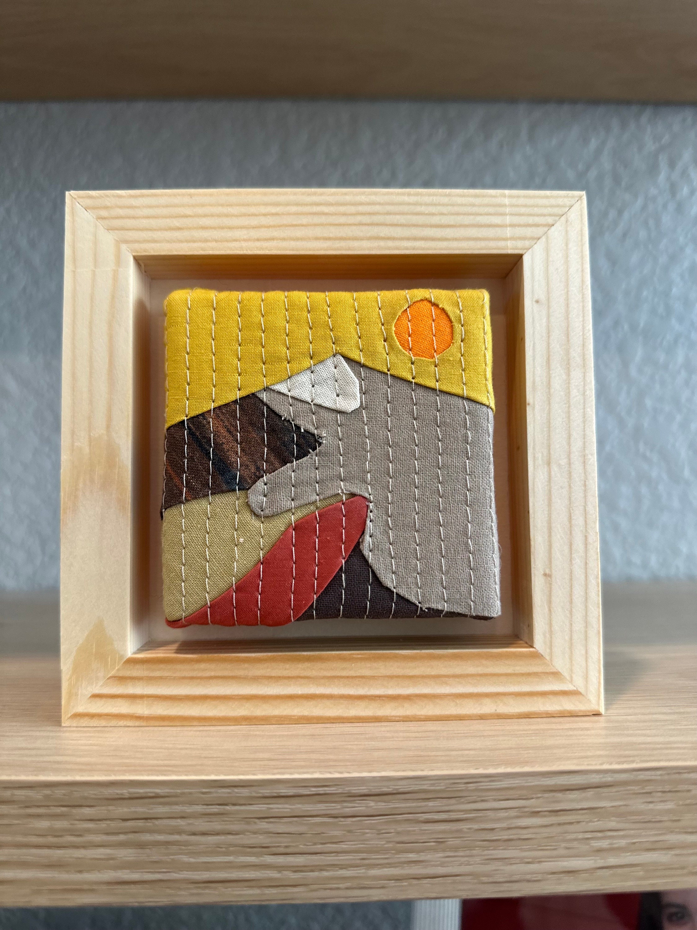 These cute mini quilts of the mountains are 5” x 5” x 1 . They are self-standing or can be hung on the wall.