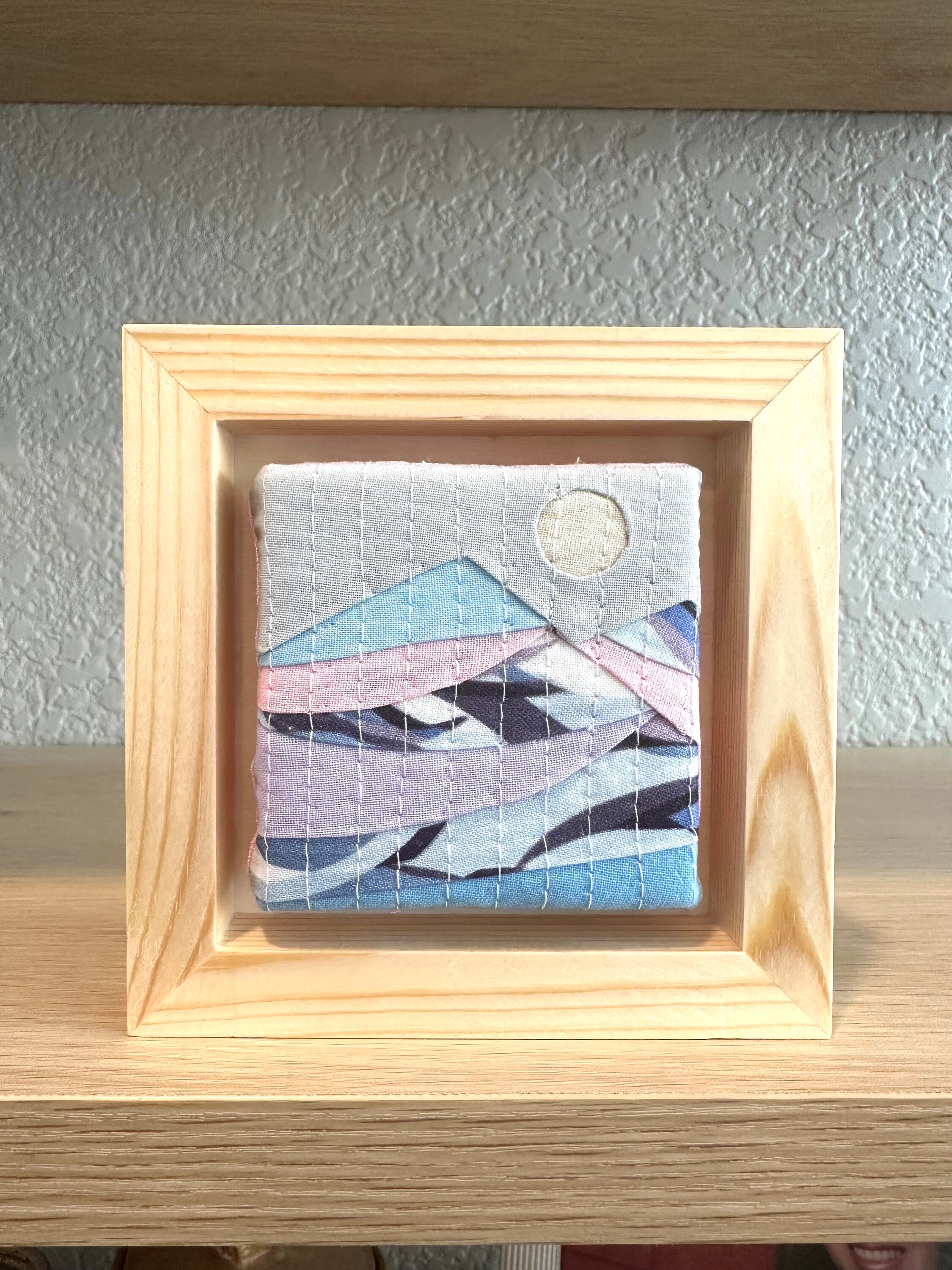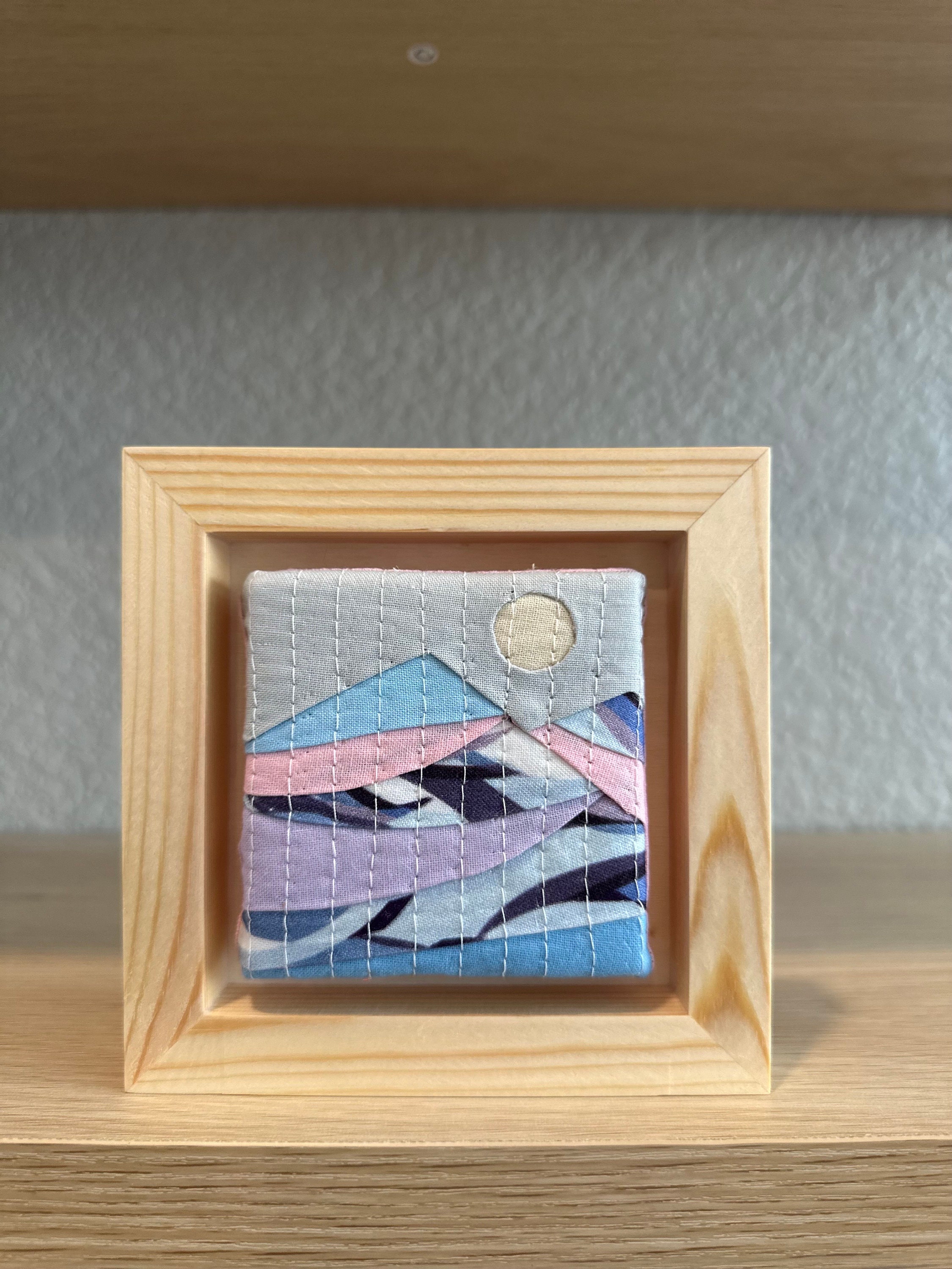 These cute mini quilts of the mountains are 5” x 5” x 1 . They are self-standing or can be hung on the wall.