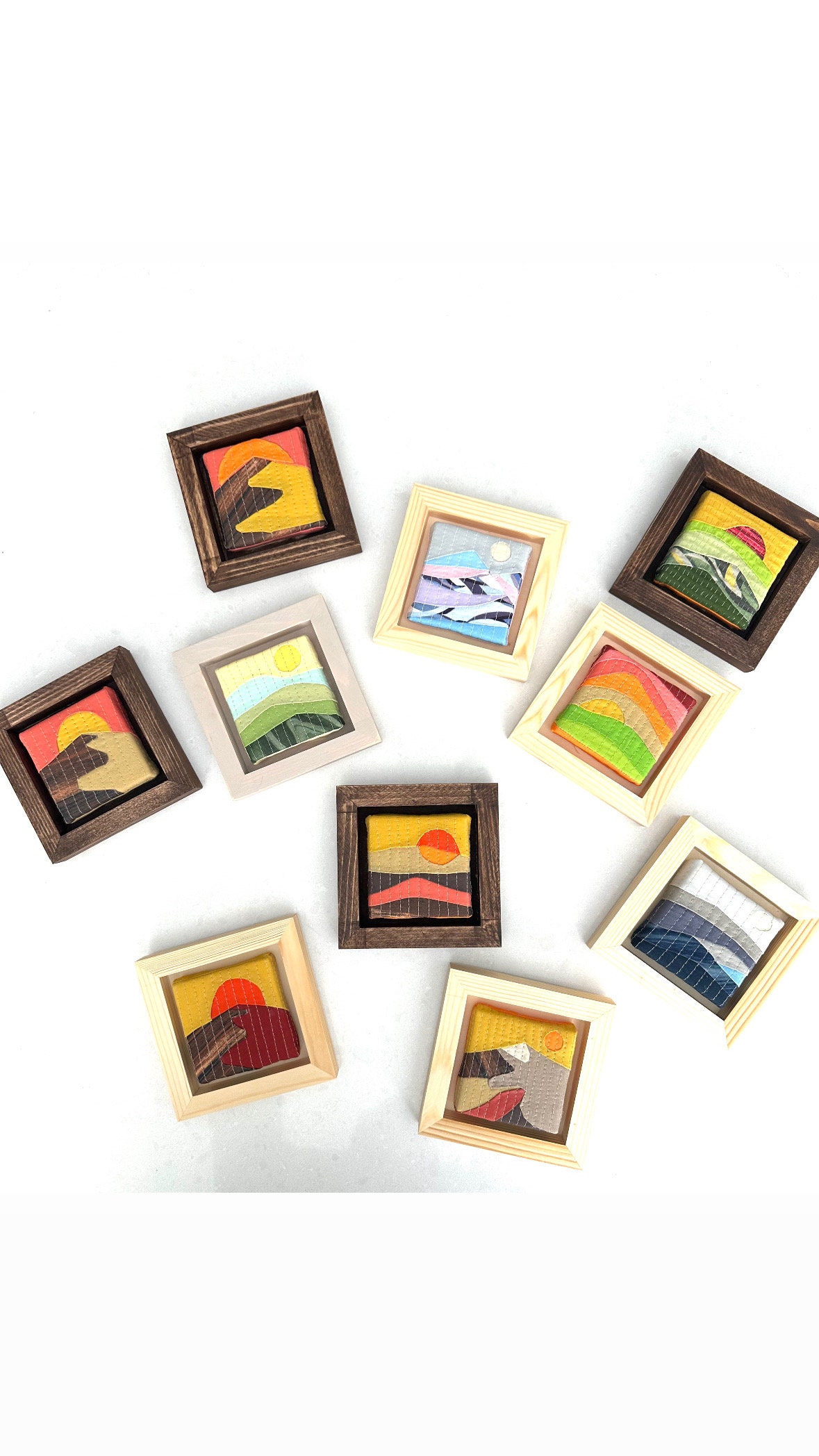 These cute mini quilts of the mountains are 5” x 5” x 1 . They are self-standing or can be hung on the wall.