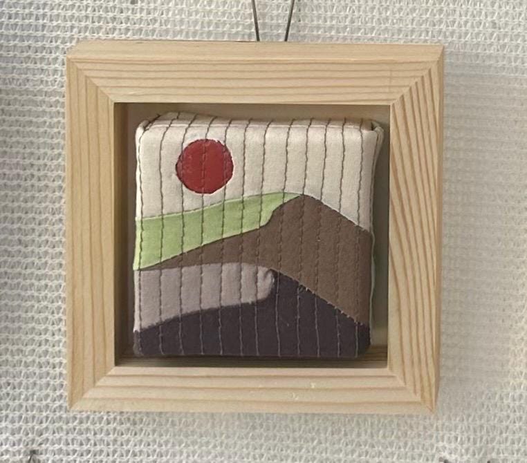 These cute mini quilts of the mountains are 5” x 5” x 1 . They are self-standing or can be hung on the wall.