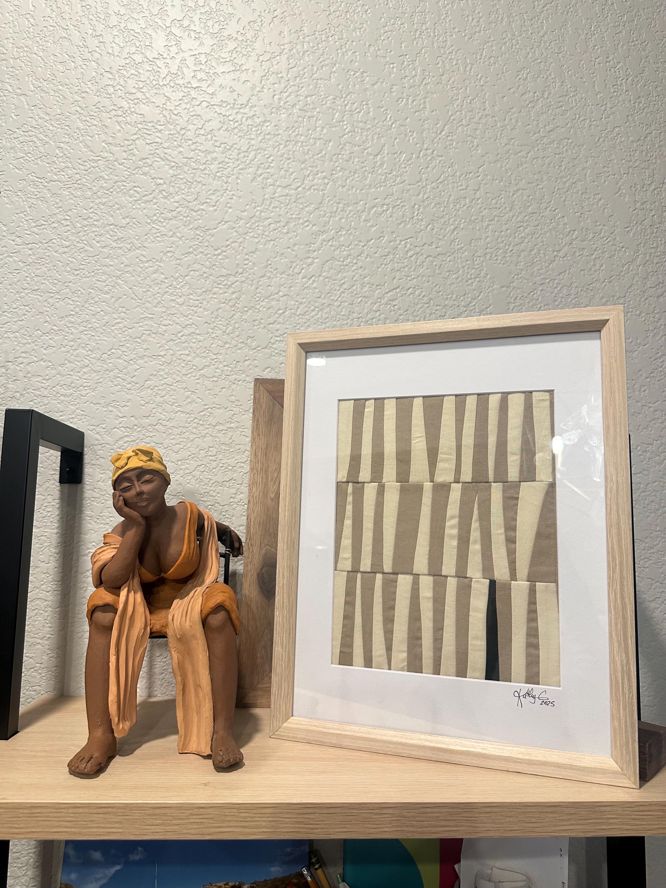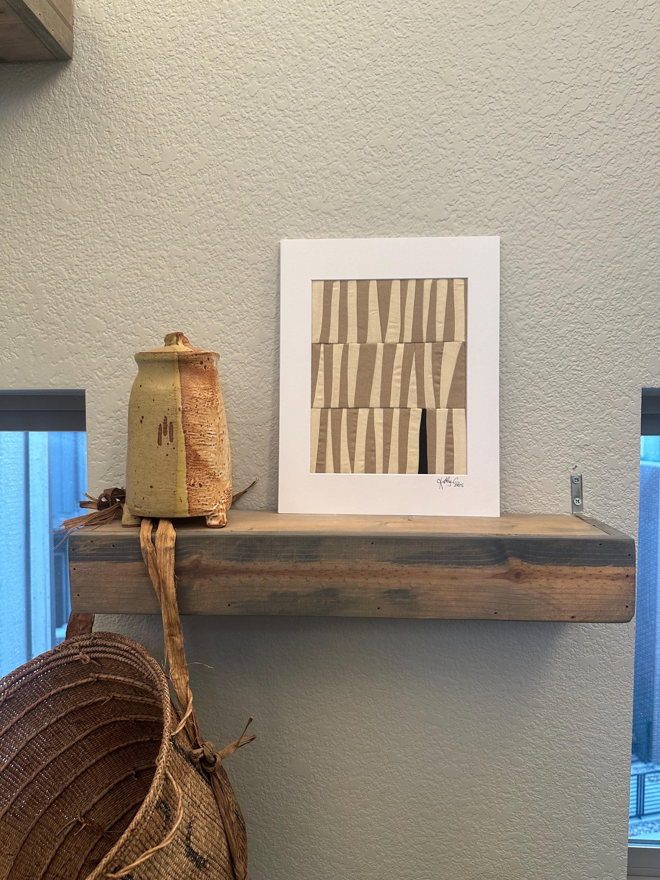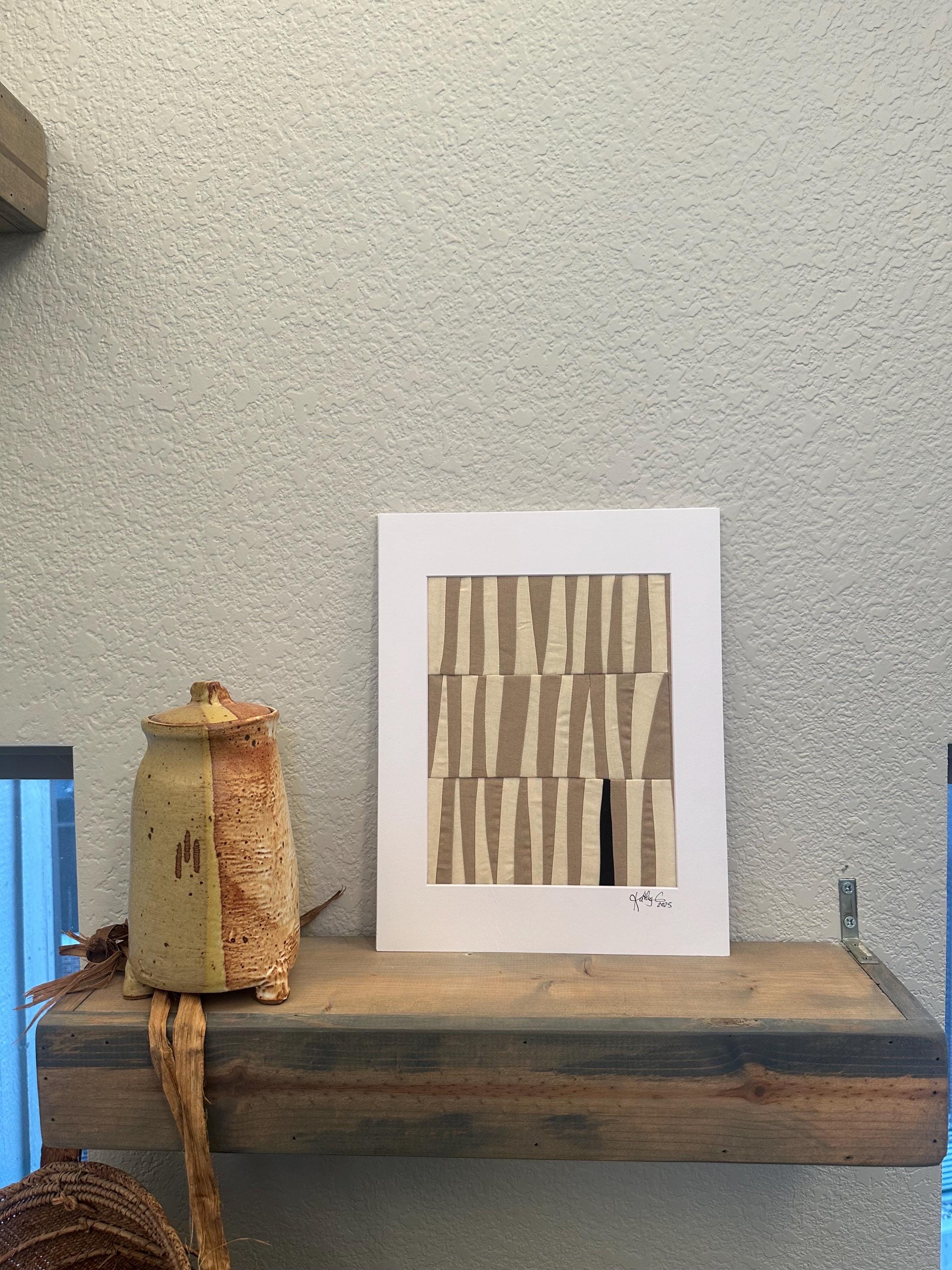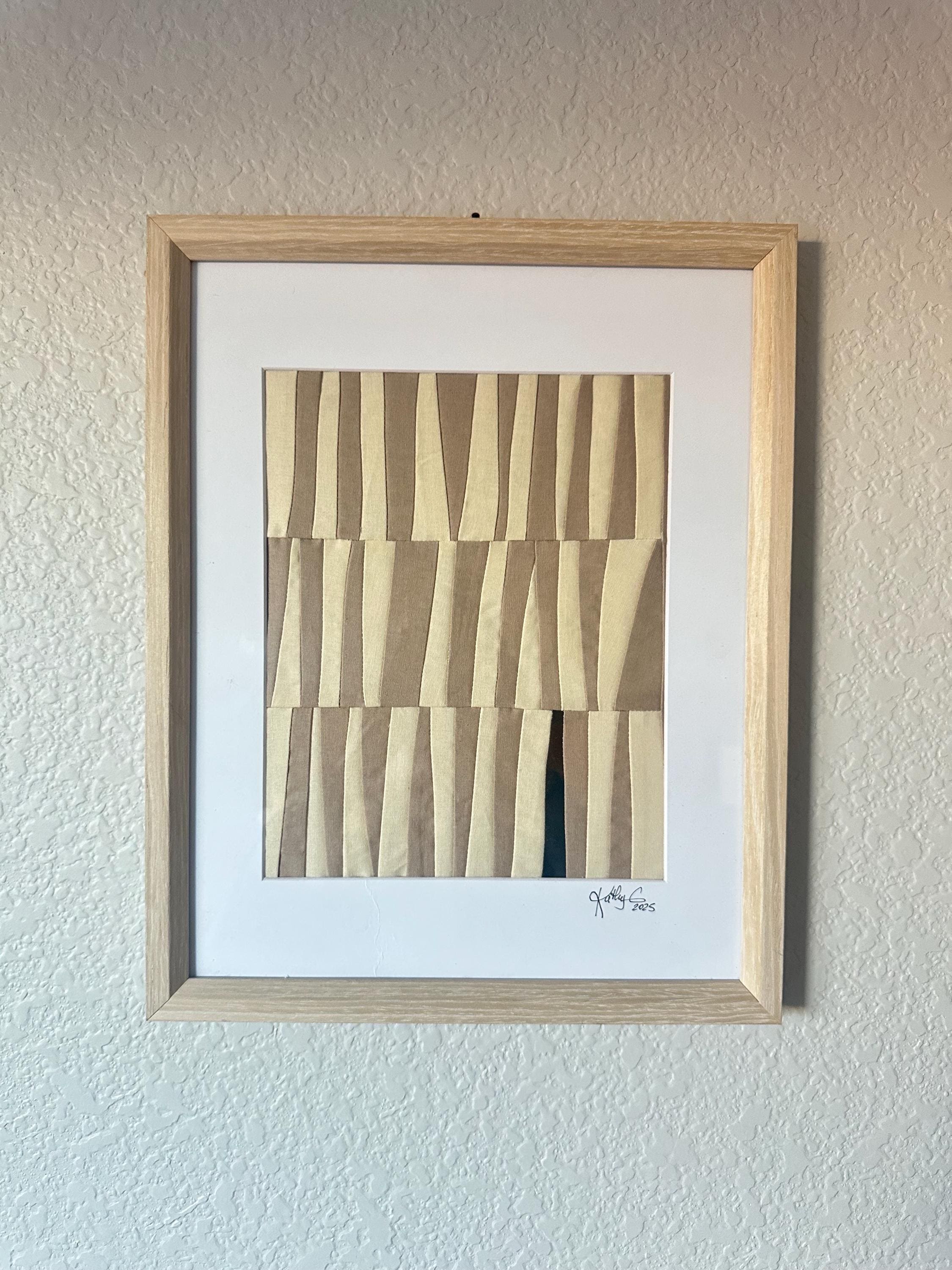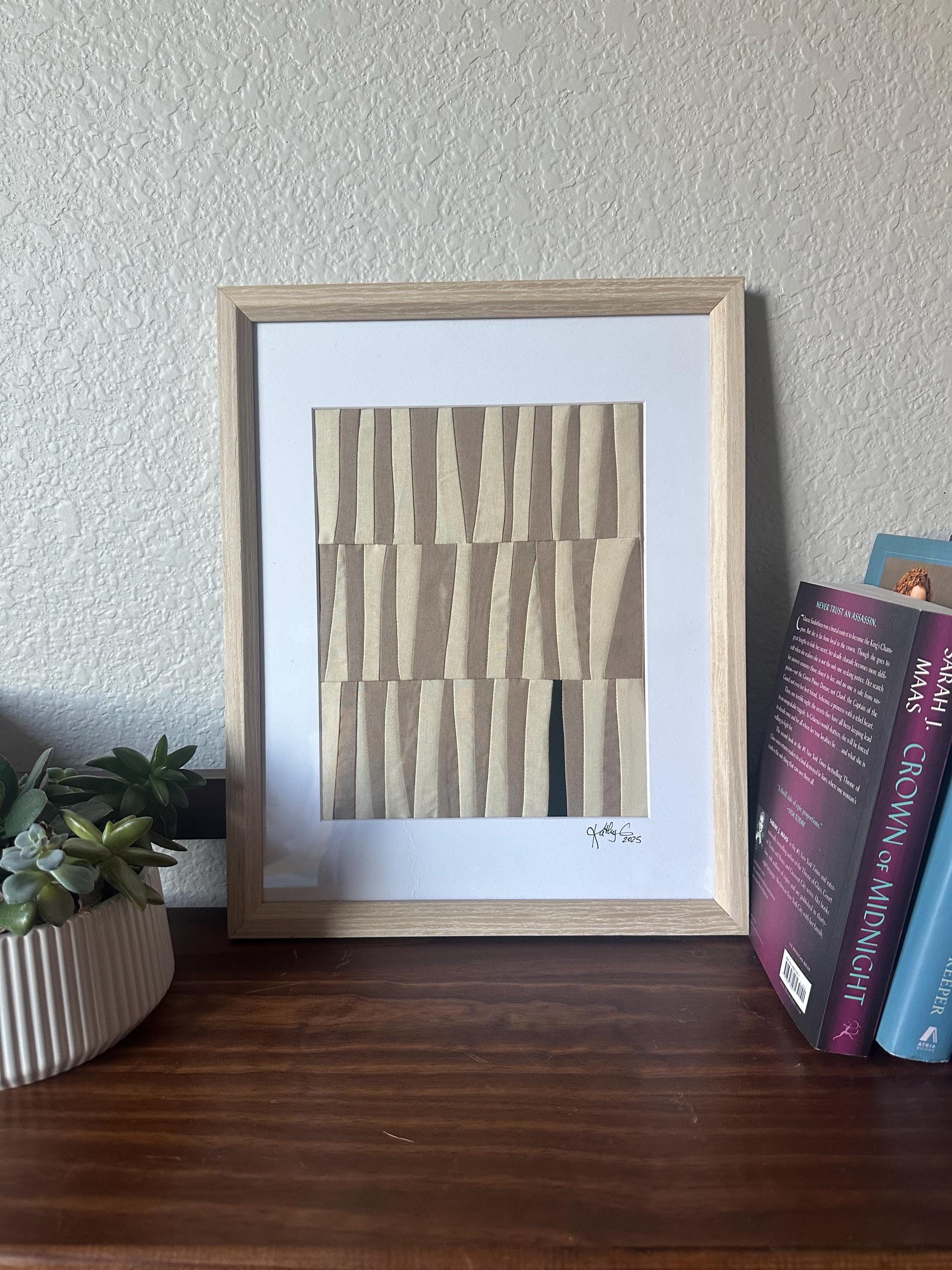 Beige and brown geometric abstract wall art piece .The patterns feature irregular or staggered stripes on natural tones.