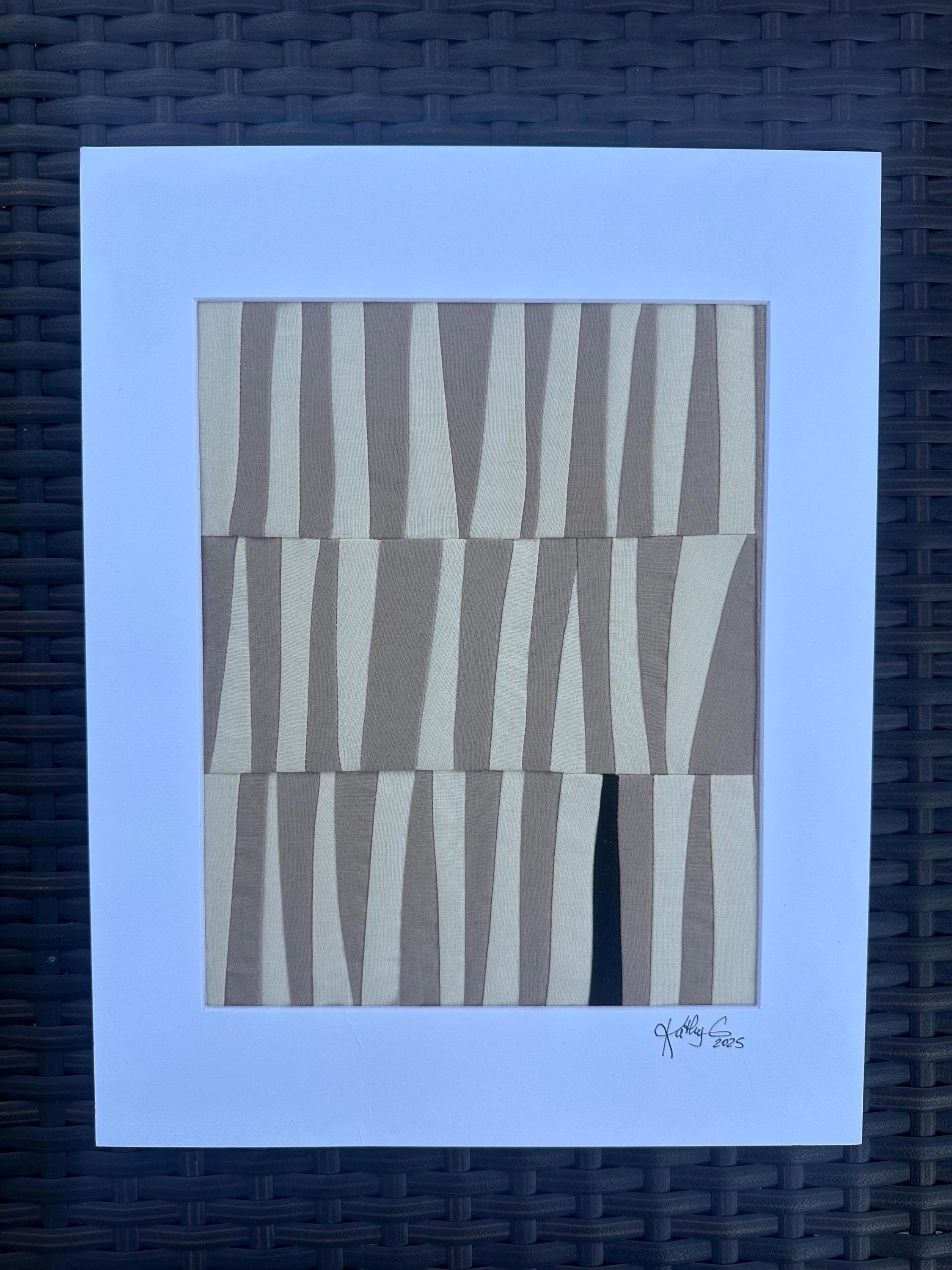 Geometric abstract composition made with cotton fabric scraps. Pieced and sewn, then pasted to an acid free backboard .