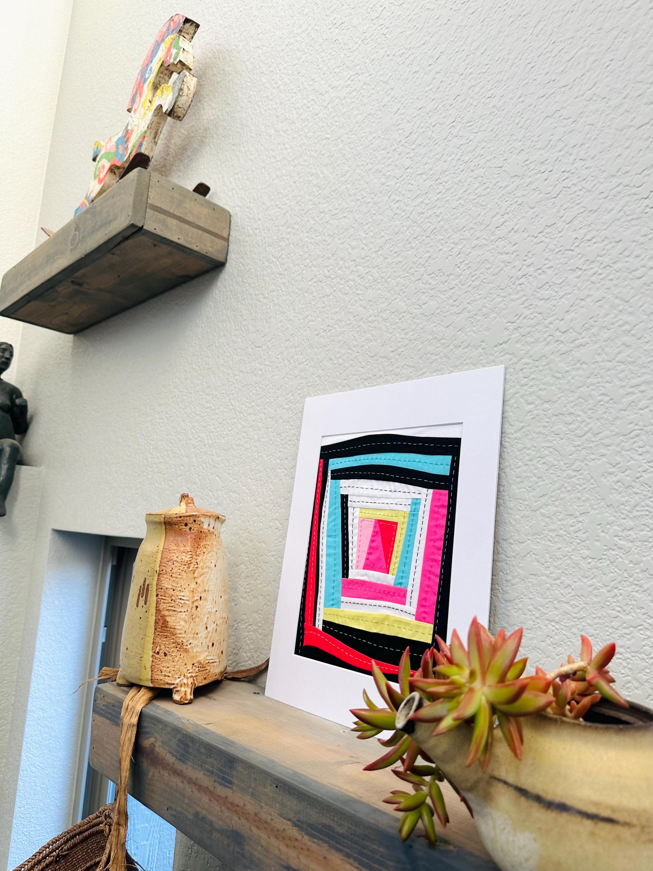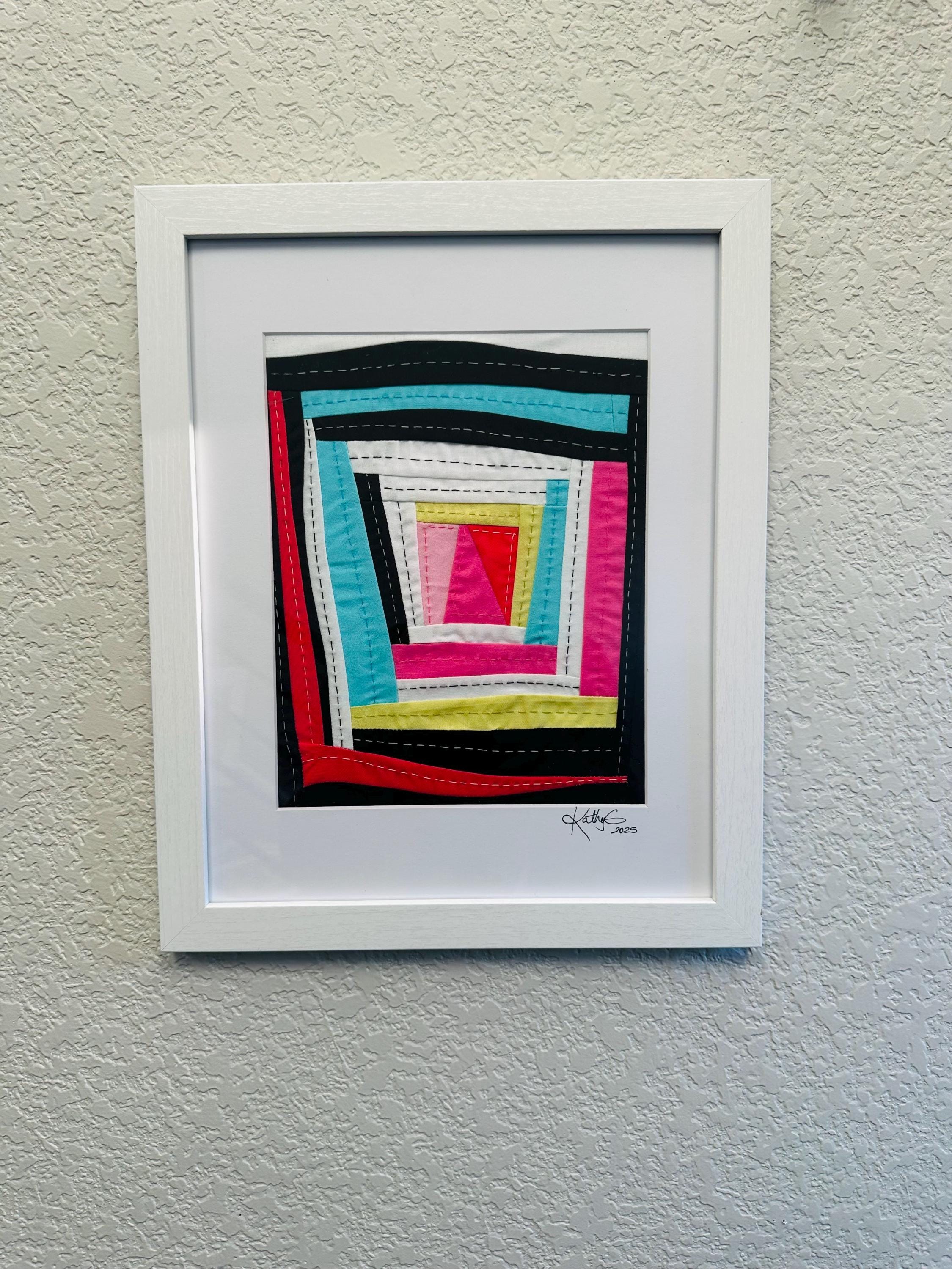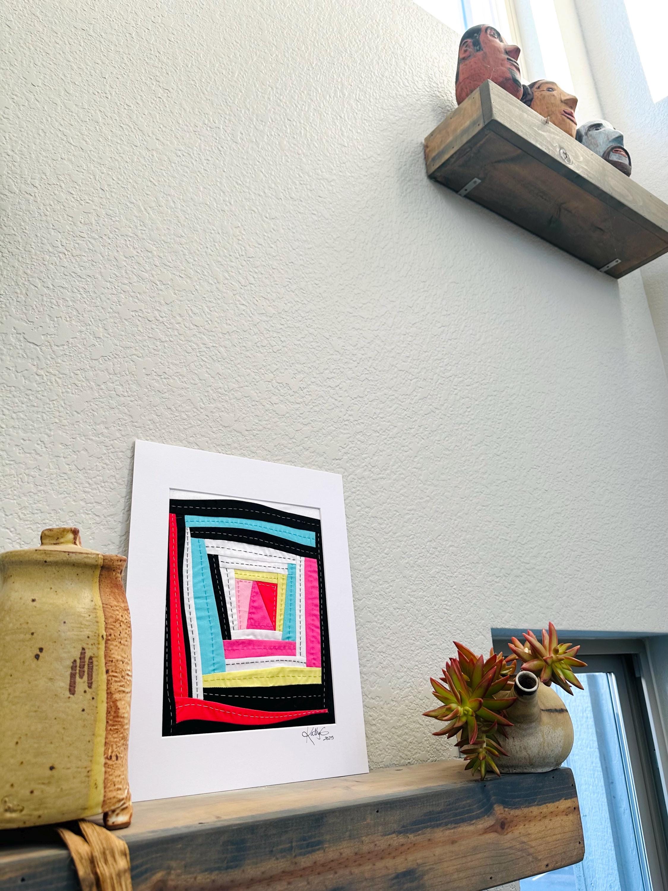 Geometric abstract composition made with cotton fabric scraps. Pieced and sewn, then pasted to an acid free backboard .