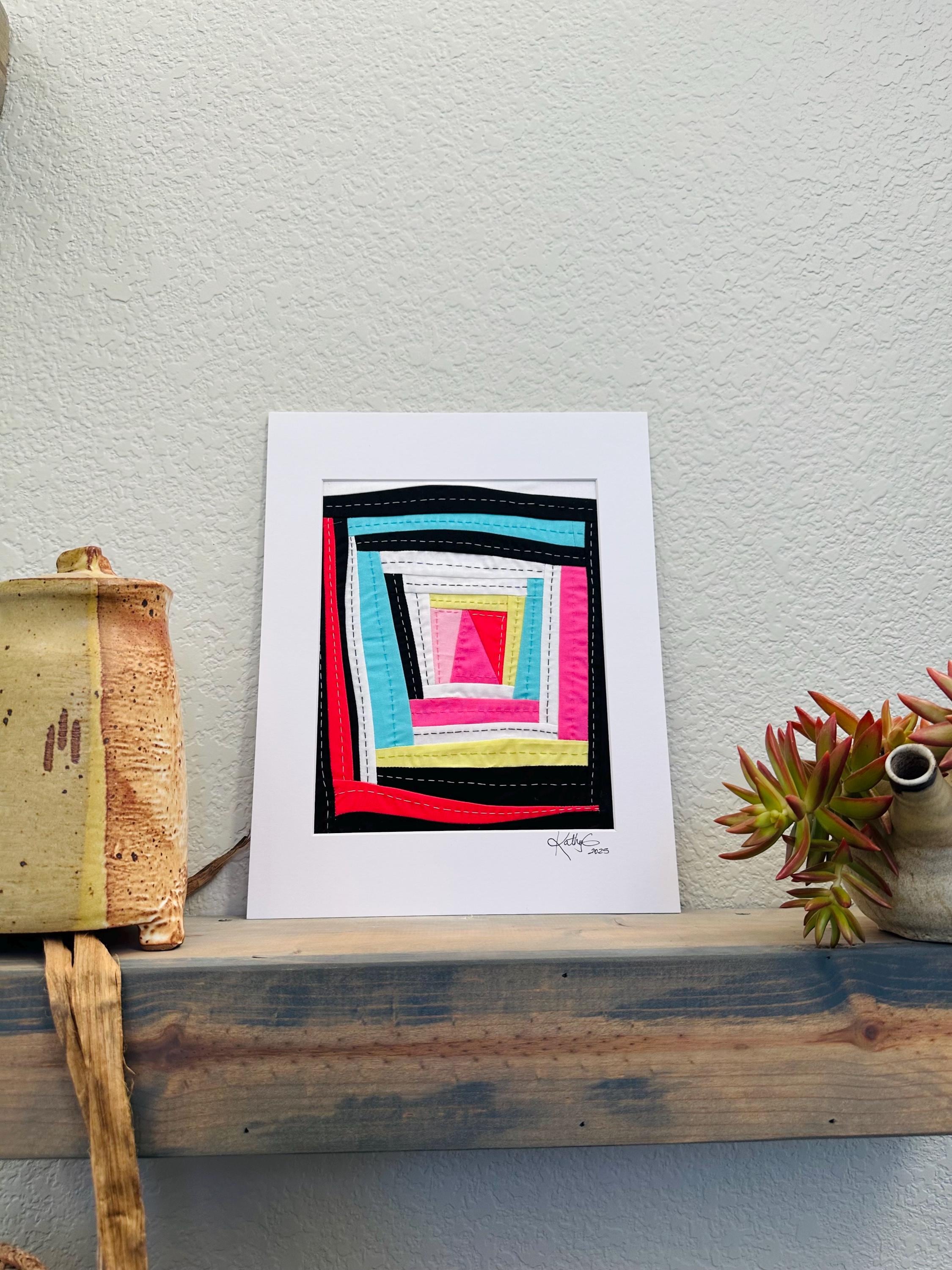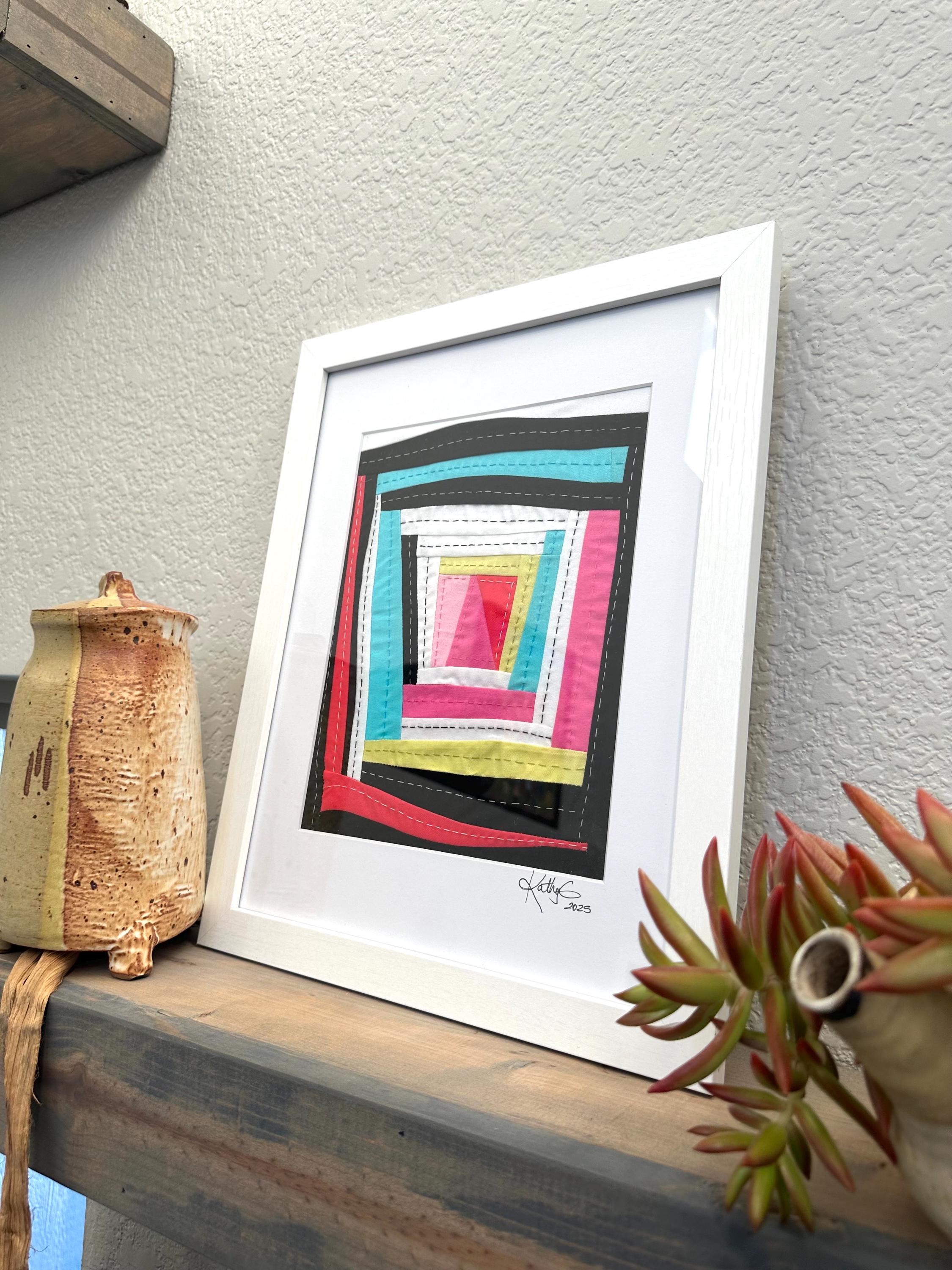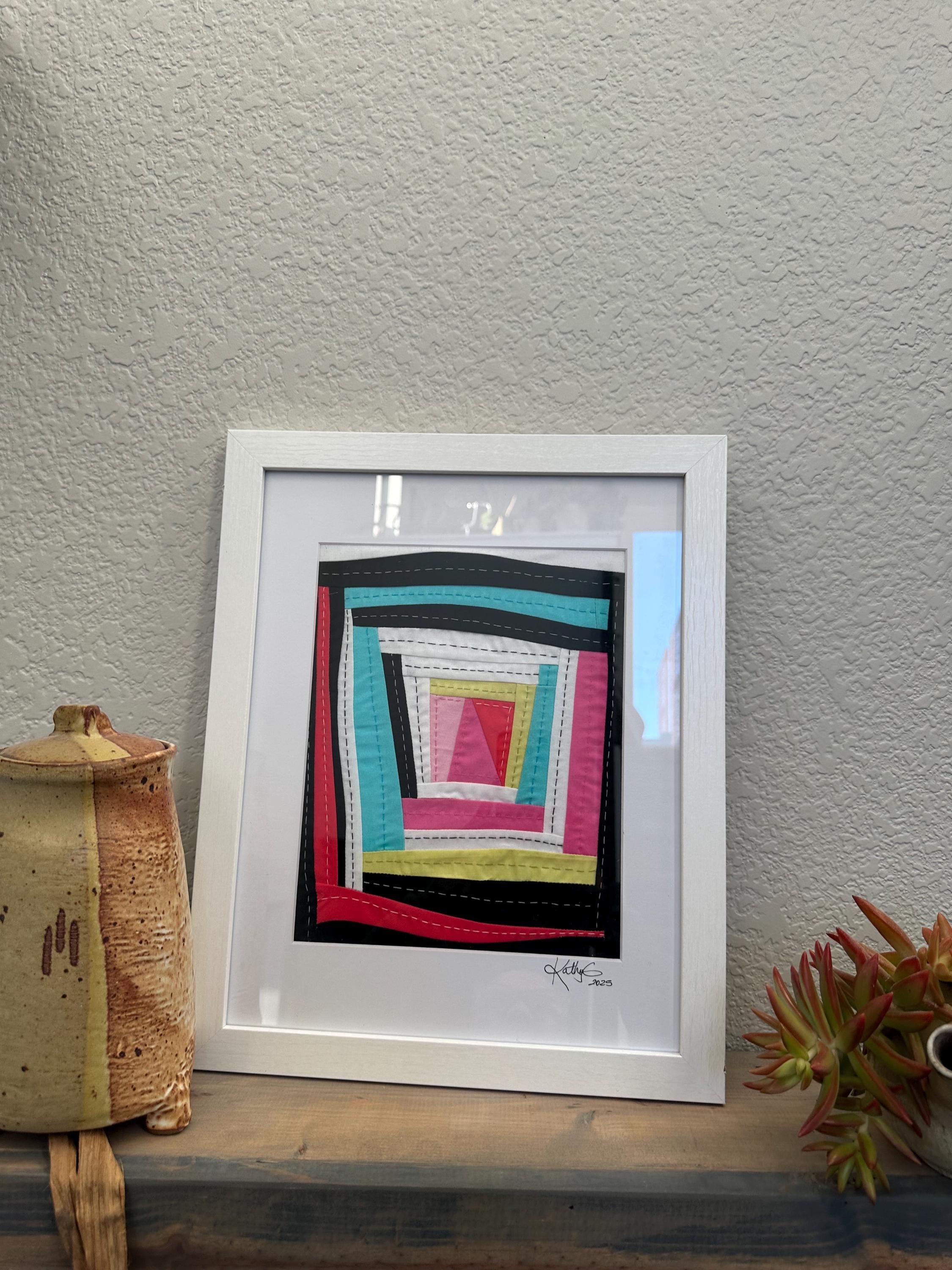 Geometric abstract composition made with cotton fabric scraps. Pieced and sewn, then pasted to an acid free backboard .
