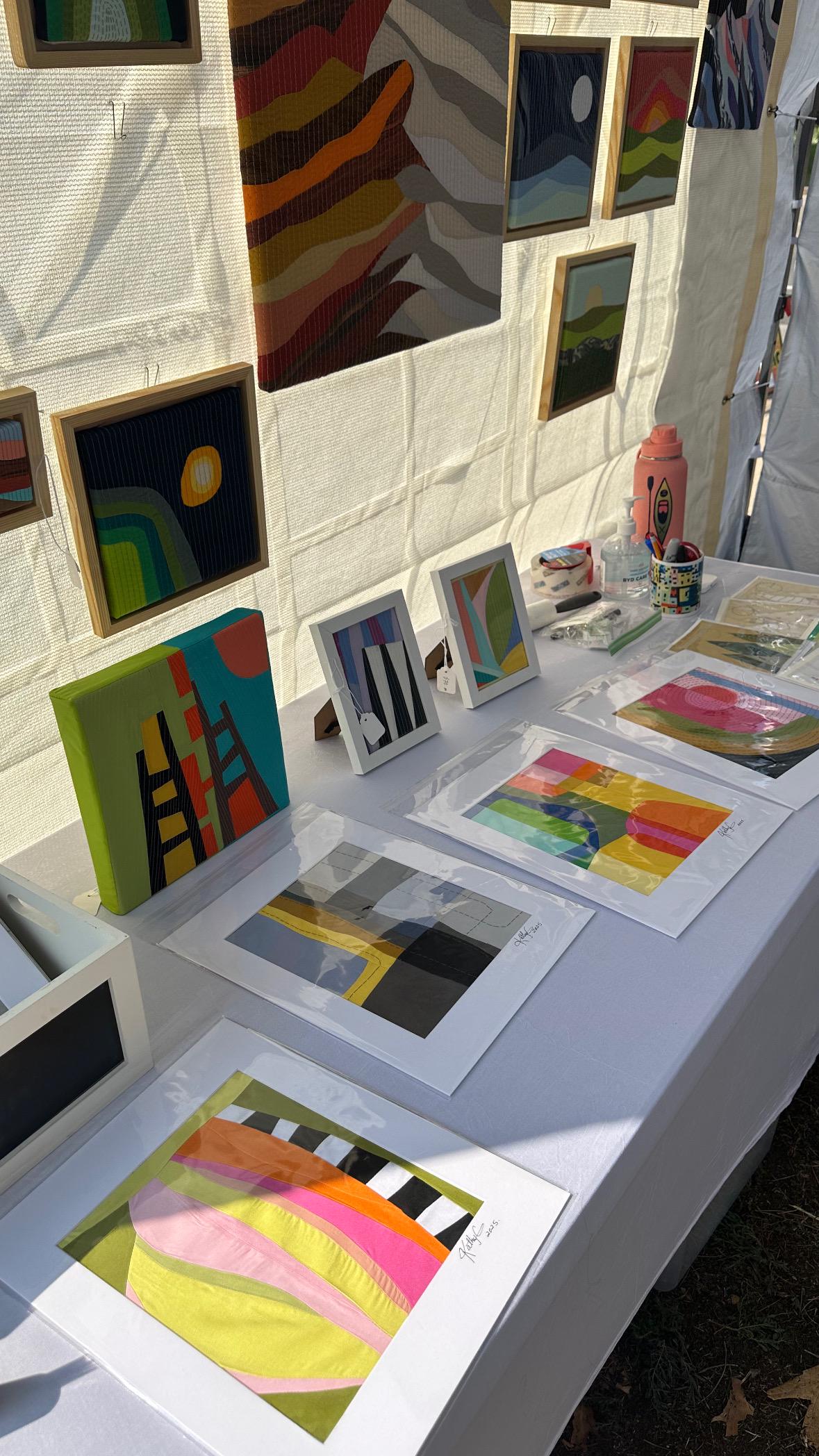 The piece uses bright colored fabrics, including pink, yellow, and turquoise, contrasted with black.